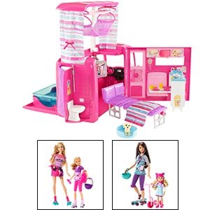 Barbie's taking her sisters camping with her in their Ultimate Sisters 'Glampe'r. There's room for everyone to sleep, eat, play, and enjoy the great outdoors!When latch is released, camper top pops up to reveal a second story tent with bunk bed hammocks to sleep in. The driver's side panel of the camper folds down with a removable Jacuzzi on it. The passenger's side panel features a real working door for Barbie to get into the camper, a doggie door for the pets to enter, and folds out into a kitchenette. The kitchen counter rotates out to reveal a dining booth where everyone can eat. The refrigerator and oven really open. A bottom drawer folds down to become a food & water dish for the pets. The bathroom is in the back of the camper, and can be rotated outdoors to be an outhouse. The toilet can be flipped inside or outside by itself, so that Barbie has a shower as well. The driver's/passenger's bench seat can be removed for campsite seating. It can also be unfolded to serve as a bed for 2 more sisters. The wheel cover can be removed and flipped over to become a doggie/kitty bed. Camper also comes with Taffy puppy, place settings (plate, fork, knife, spoon, & cup) for all 4 sisters.olls included are: Barbie, Stacie, Skipper and ChelseaBarbie and Stacie are ready for an afternoon out skating together complete with glam skating fashions, roller skates that really roll and helmets for safety, of course Skipper and Chelsea dolls are ready for an adventure with Skipper cruising on her skateboard with headphones, while Chelsea looks cute riding along in her scooter. Dolls cannot stand alone.